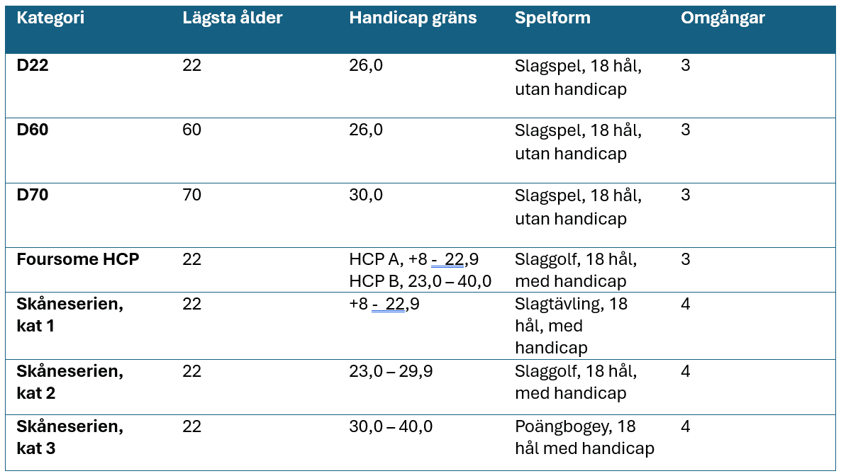 Datum och spelplatser kommer att finnas på Skånes Golfförbund så snart dessa är bekräftade! Om du är intresserad eller har frågor, vänd dig till respektive lagledare.